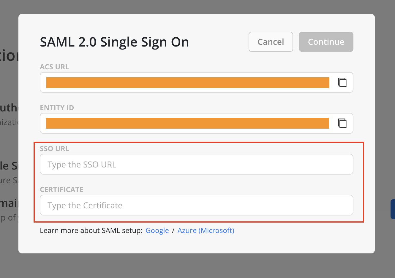 - Back in Mosaic’s SAML 2.0 Single Sign On menu, fill in: