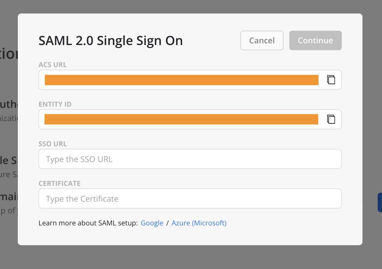 Entity IDfrom the same modal, as it will be used in a subsequent Okta configuration step.
