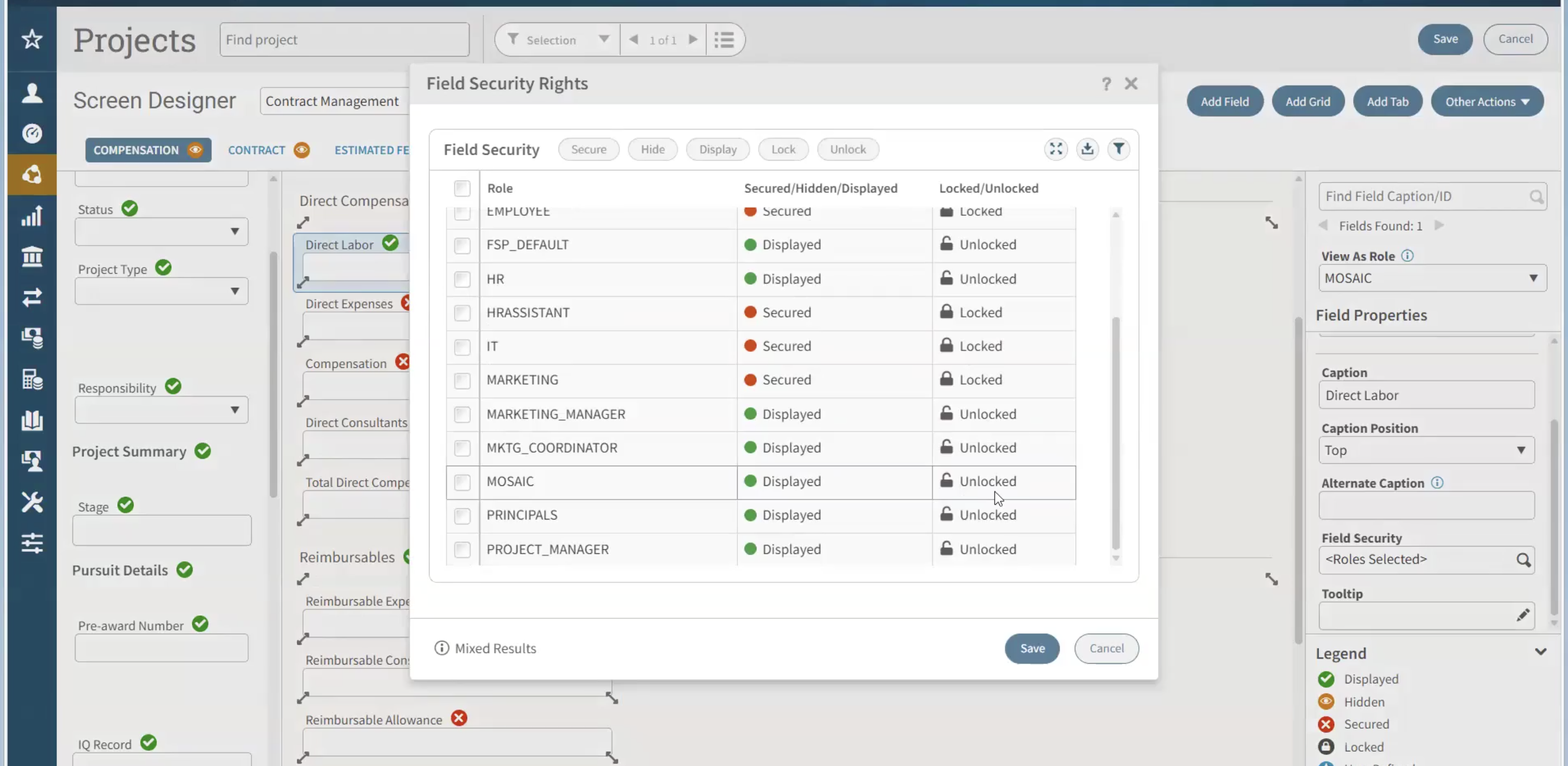- Verify that fee fields are accessible to the Mosaic API user. In the Projects Hub, go to Contract Management, enter Design Mode (Other Actions > Design), and confirm that the fee fields your integration needs (e.g., Direct Labor, Direct Expenses, Consultants) are set to Displayed for the Mosaic API user's role. See Field Level Security — Ensuring Access to Required Fields for step-by-step instructions.