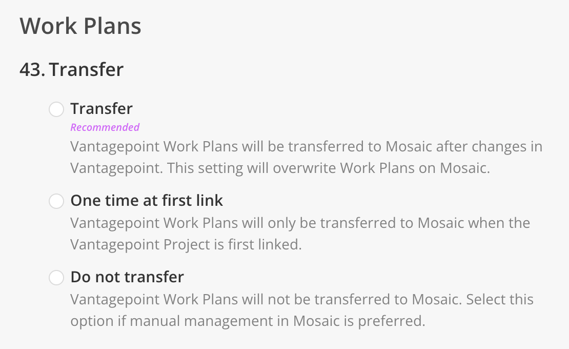 - This option only sends work plans during the initial work plan link from Vantagepoint to Mosaic. Any updates made in Vantagepoint to synced work plans will not be reflected in Mosaic. However, any edits made directly to the work plan in Mosaic will be preserved.