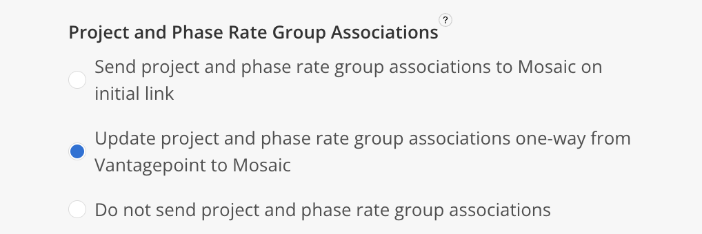 - Rate Groups > Send rate groups (and their rates) one-way from Deltek Vantagepoint to Mosaic.