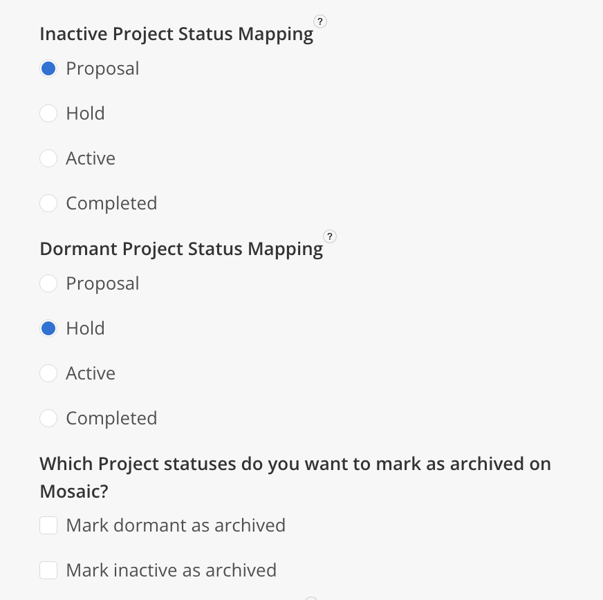 Options for Mosaic Project Status mappings: