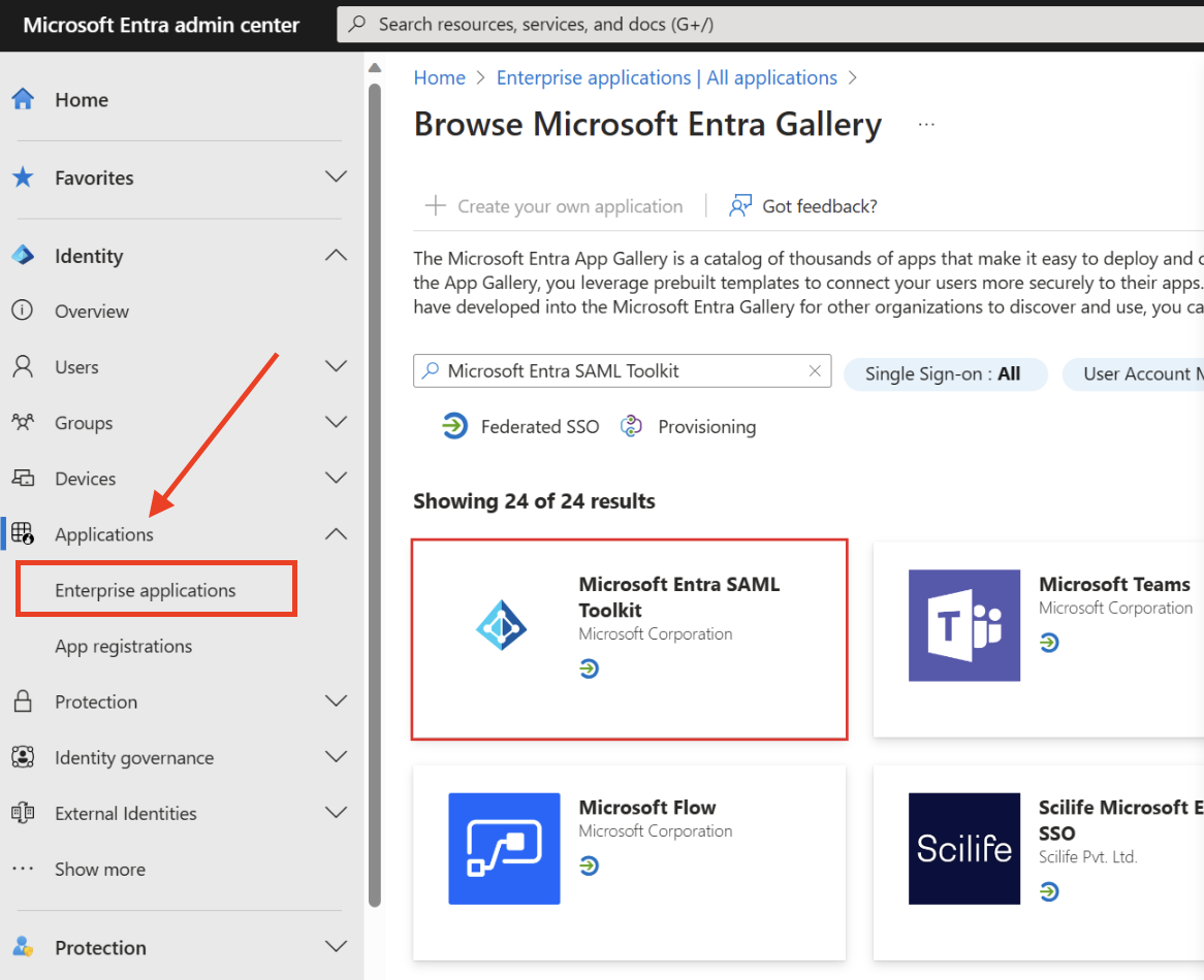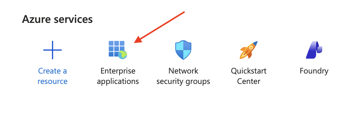 - On the Welcome to Azure! page or Microsoft Entra admin center, click the Enterprise applications option.