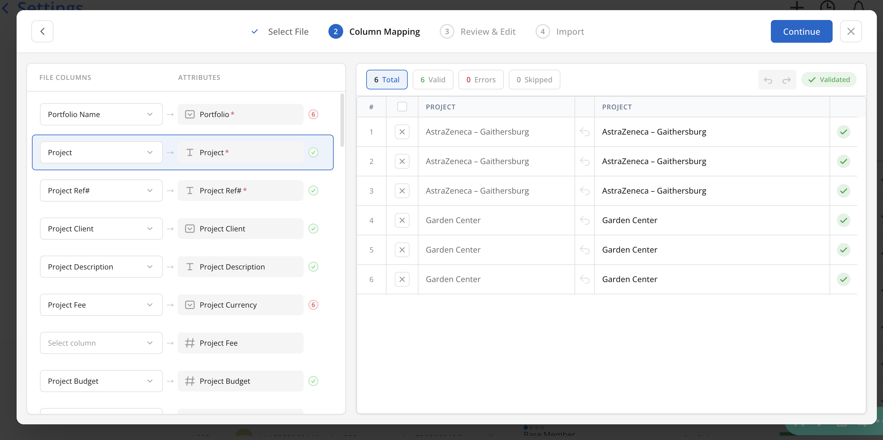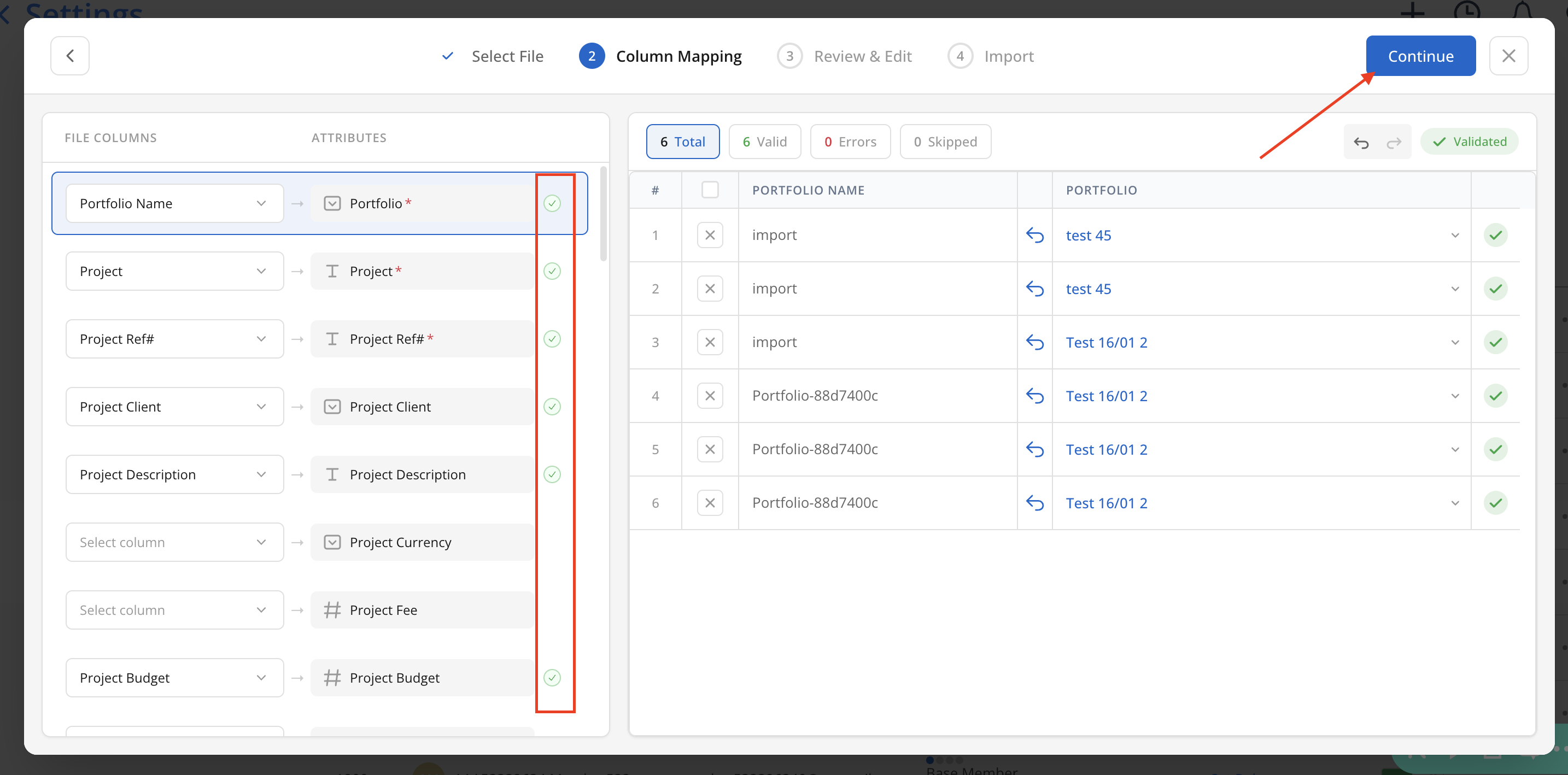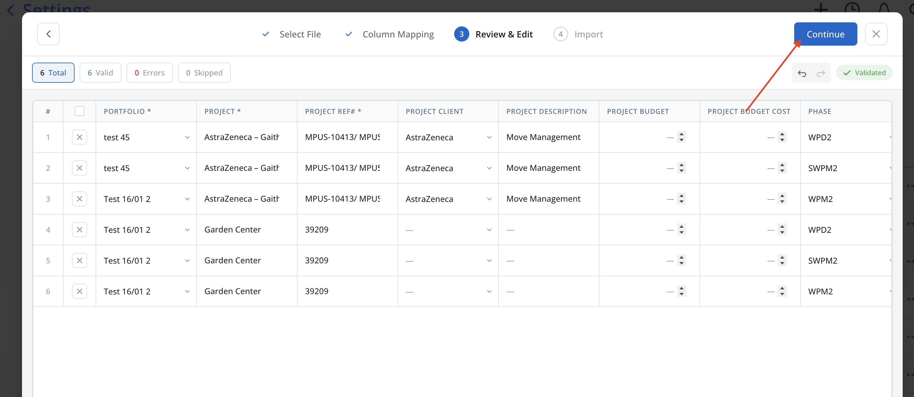 Continuein the top right corner. Review your data once more and clickContinue. Then clickConfirm Importin the Import step.