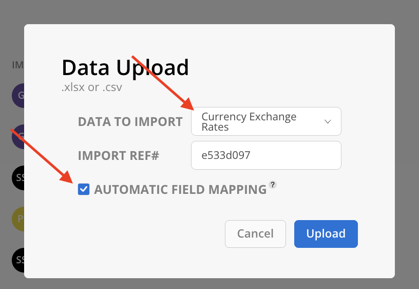button. Select Currency Exchange Rates as the Data to import. De-select the Automatic Field Mapping option to prevent columns from automatically mapping, thereby avoiding potential improper data imports. -