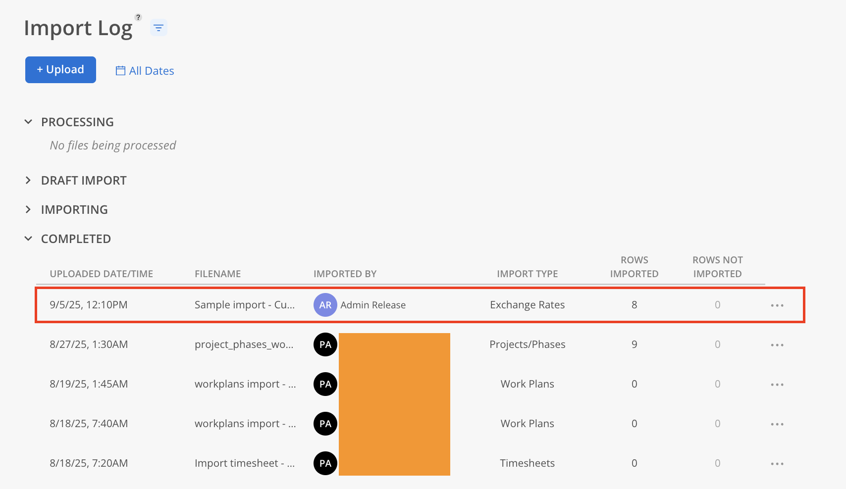 - Once the upload is complete, the import will appear in the Processing section. Allow time for the import to finish.