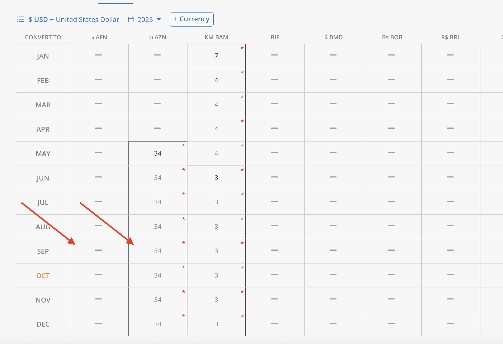 For Source Currency = USD, Destination Currency = AZN, Month = 2025-05, and End Month = 2025-09. The rate applies only from May through September, since those months already have values.