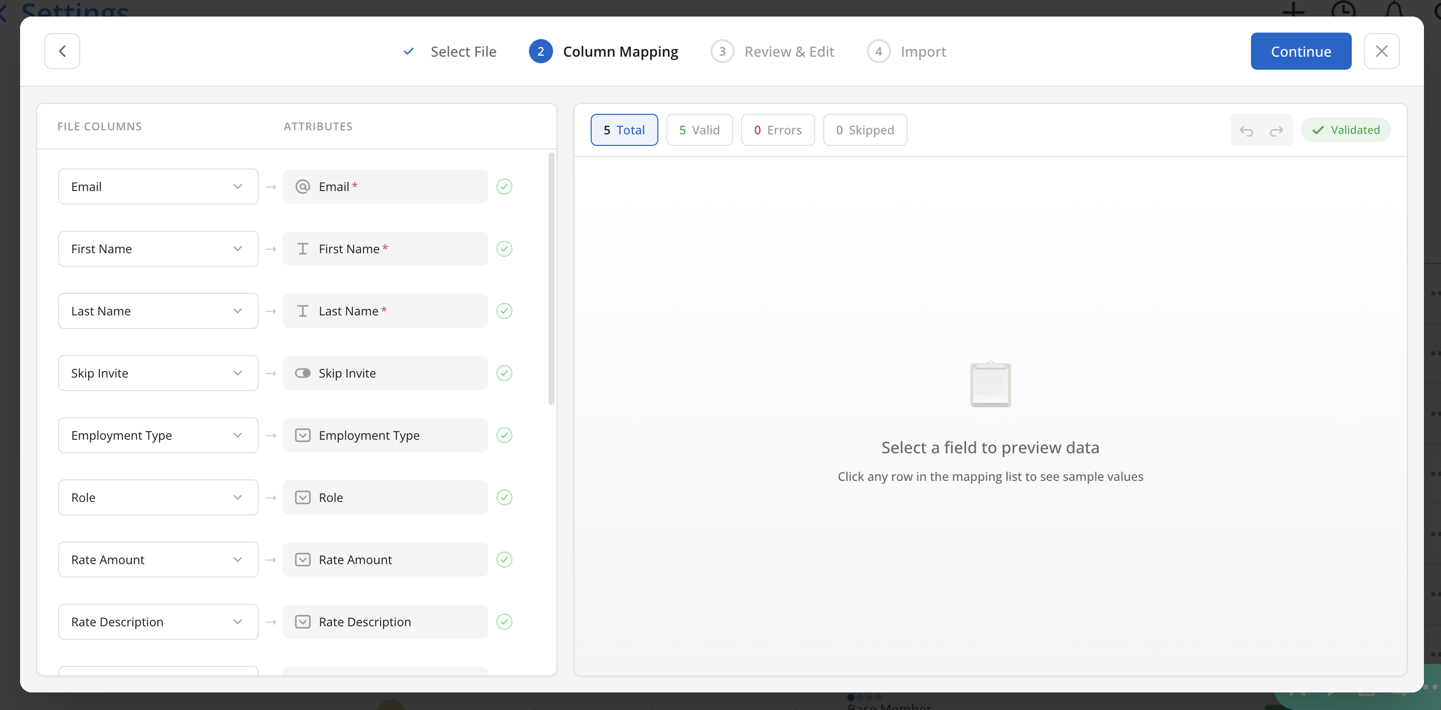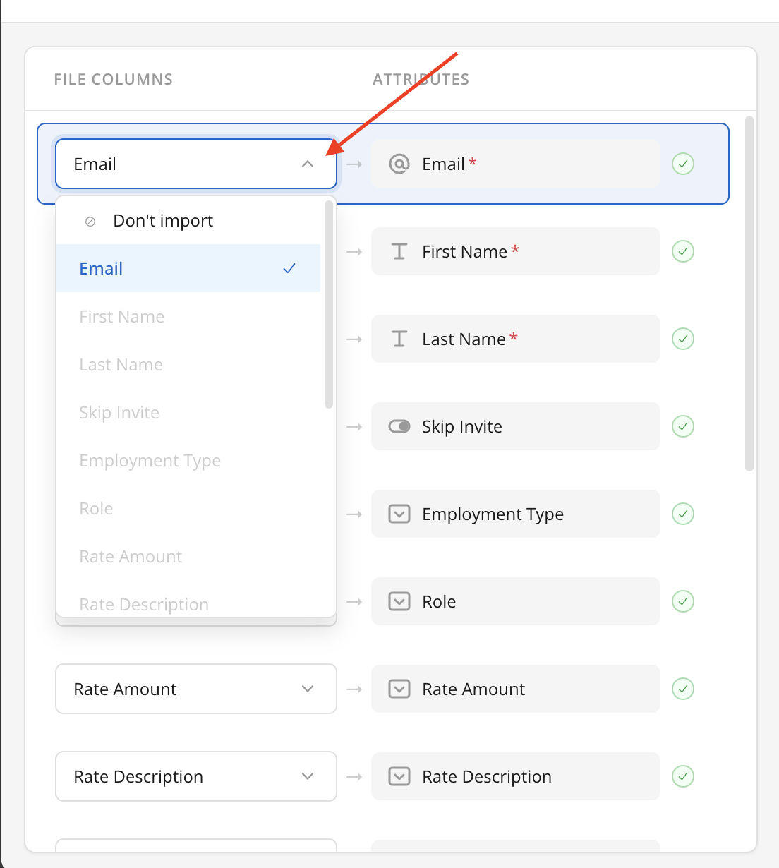 After the file is uploaded, the system attempts to automatically map the required information. Mapped columns can be adjusted by selecting a different option from the dropdown. To exclude a column from the import, select