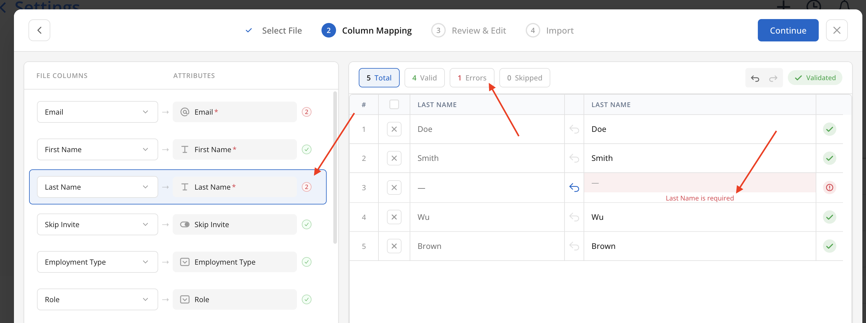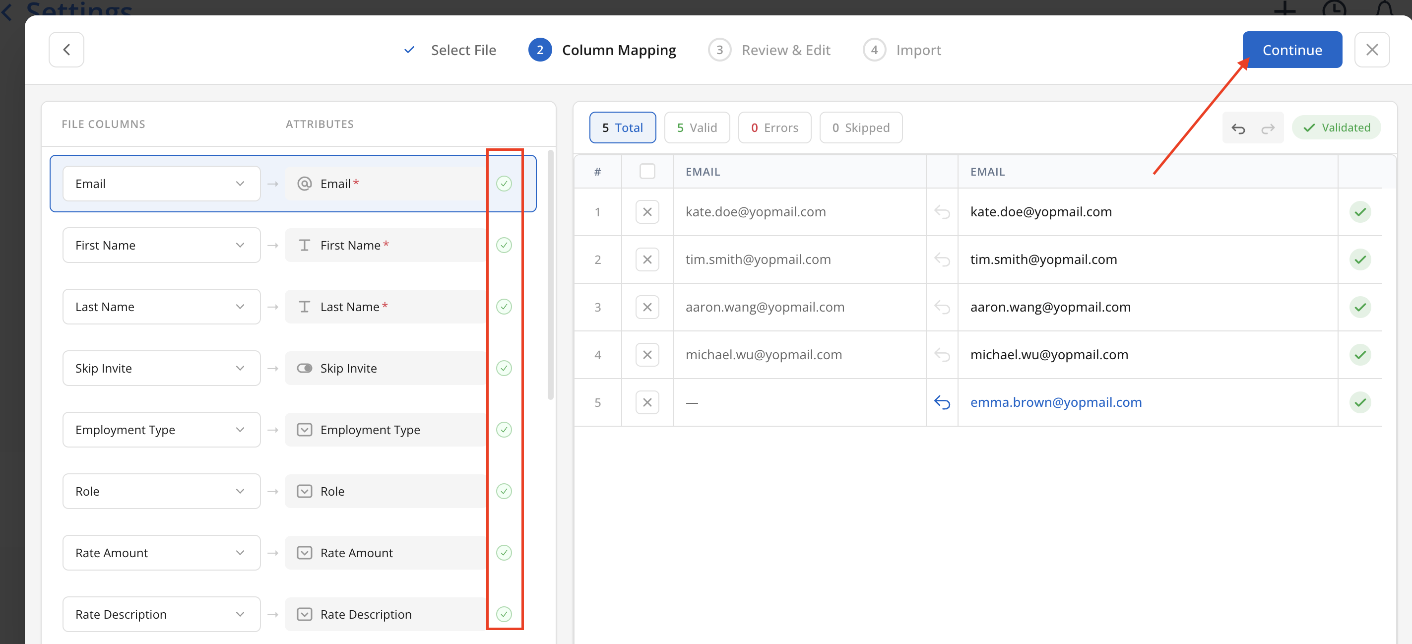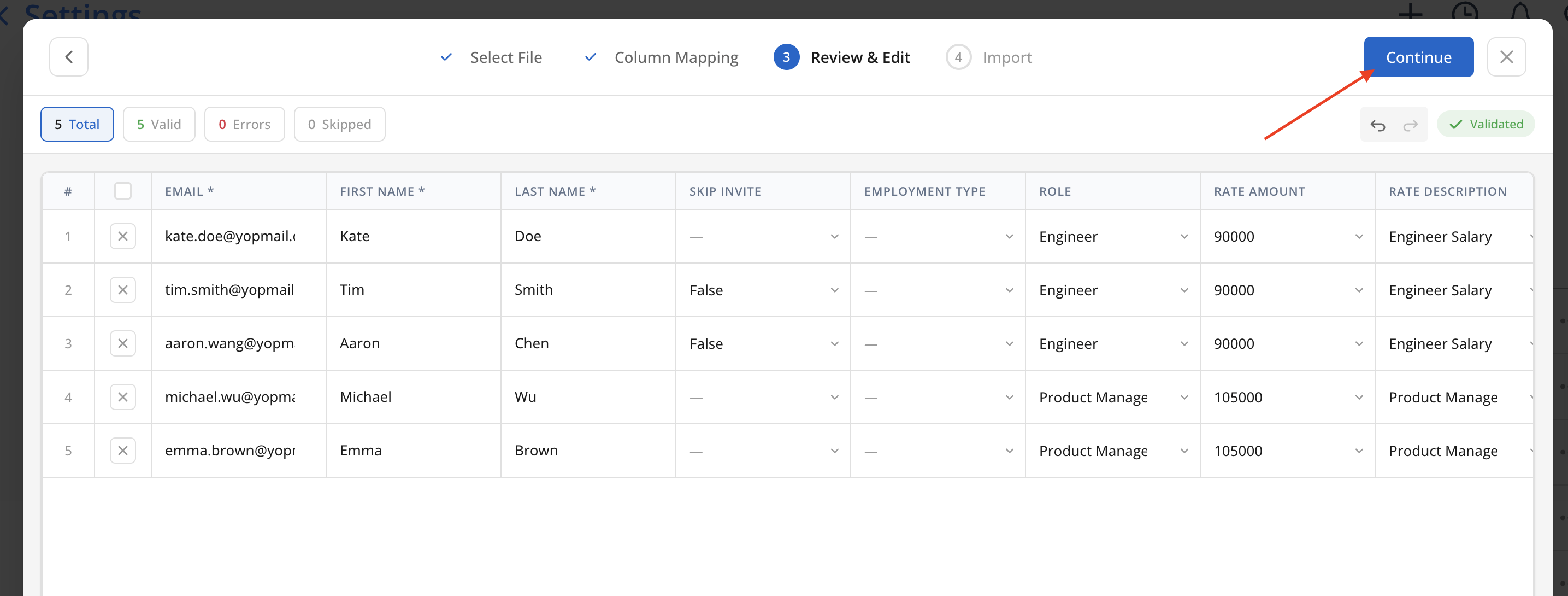 Continueon the top to the Review & Edit step. If all data looks good, clickContinueto the Import step.