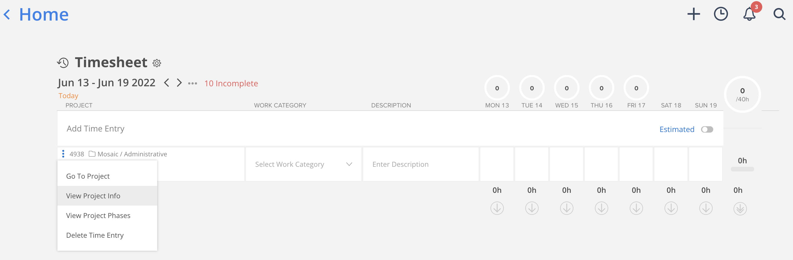 - Click on the project and select a phase (if any). This will create a time entry like below.