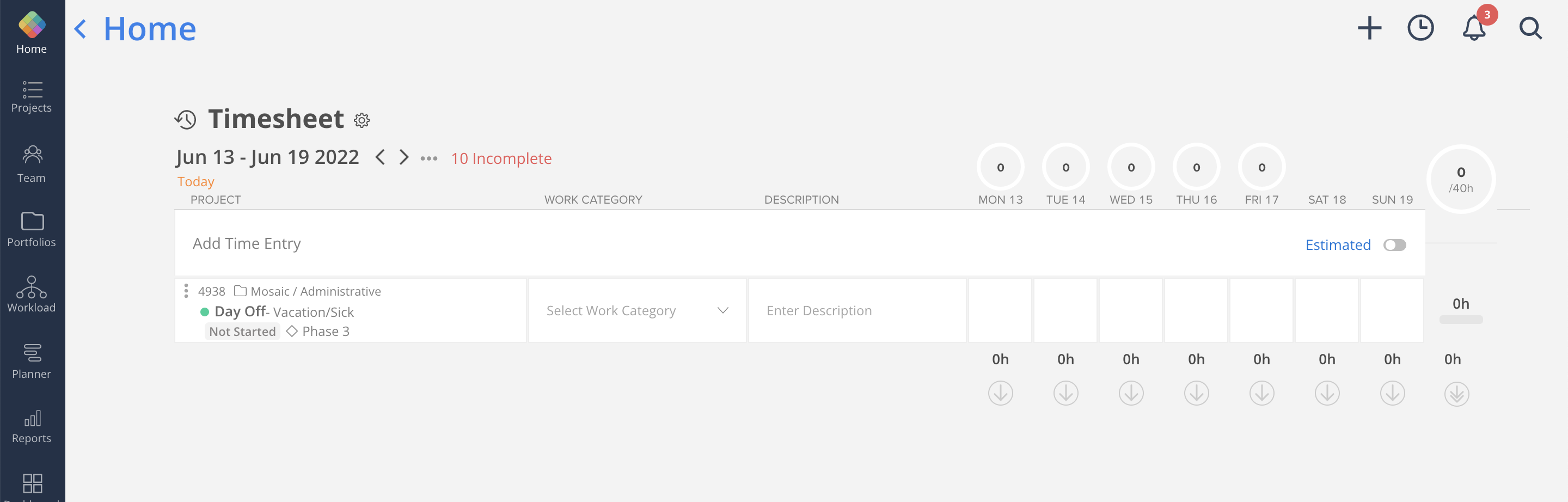 The process is the same as normal work plans, but since Time Off project is a default project that is created by Mosaic, so you won't be able to find it in your projects or portfolios.